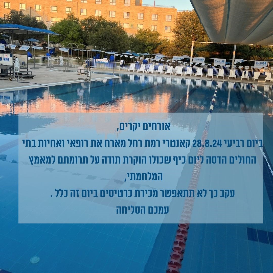 אורחים יקרים, ביום רביעי 28.8 , קאנטרי רמת רחל מארח את רופאי ואחיות בתי החולים הדסה ליום כייף שכולו הוכרת תודה על תרומתם למאמץ המלחמתי, עקב כך לא תתאפשר מכירת כרטיסים ביום זה כלל .